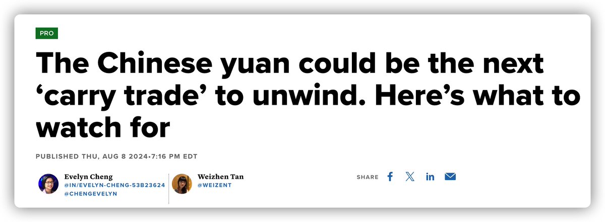 CNBC Pro 写到,人民币可能是下一个要解除的“套利交易”。