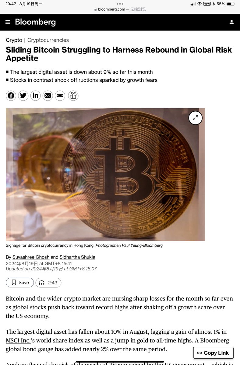 彭博社今天这篇文章写出了全球股市在摆脱对美国经济增长的担忧后,正在向创纪录高点回升,而比特币却纹丝不动的原因。