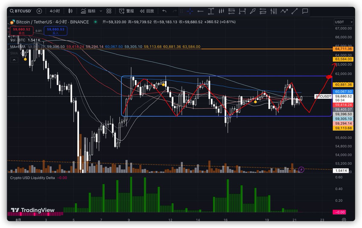 比特币注意这里的方向选择,对多头来说到了不得不突破的时候了;探讨市场先生的尿性