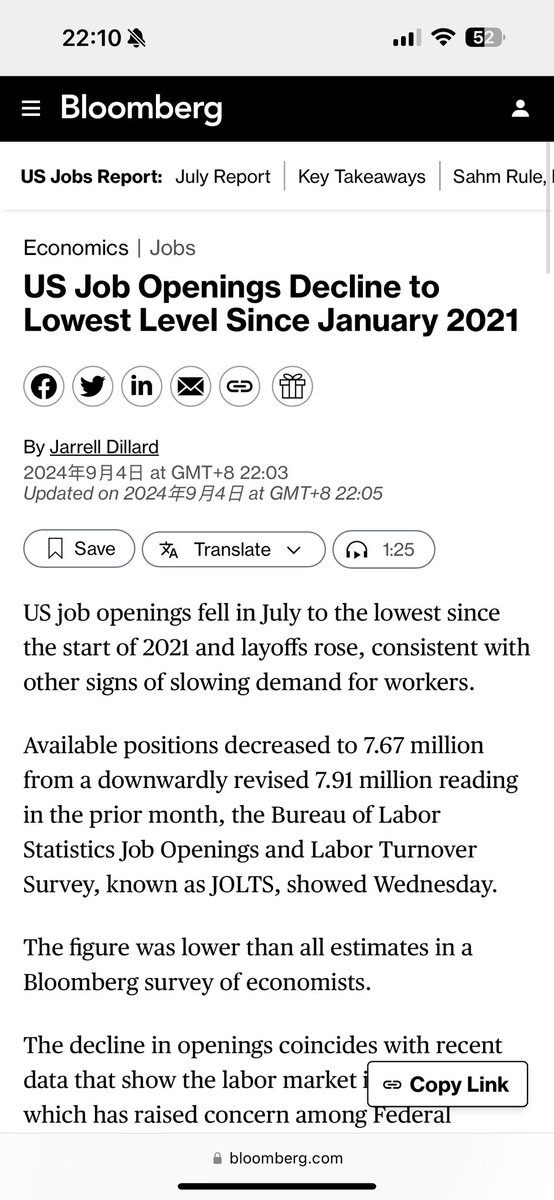 彭博社:“职位空缺的减少与最近数据显示劳动力市场放缓的情况相吻合,这引发了联邦储备官员的担忧。就业增长放缓,失业率上升,求职者找到工作的难度加大,这加剧了人们对潜在衰退的担忧。”
