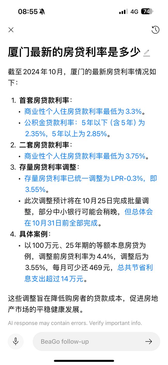 我问房贷利率多少,它帮我分好“首套房、二套房、存量房” 接着还给我举了个案例……
