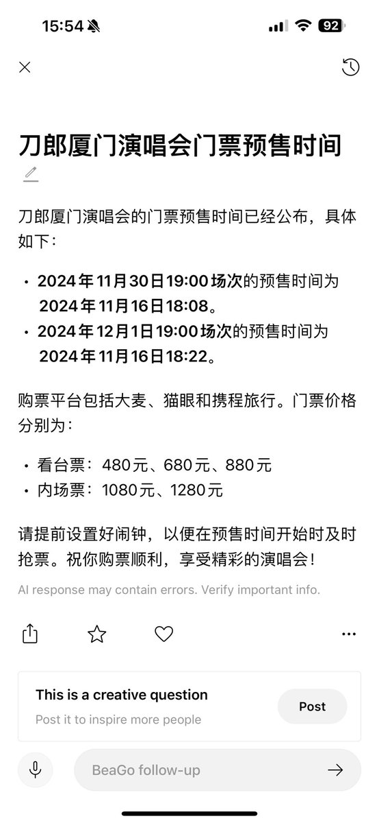 比如这个问题 ChatGPT联网就问不出来,BeaGo 一下子就知道,基本把厦门文旅的信息都告诉我了。 https://t.co/9KJqJvYUHP