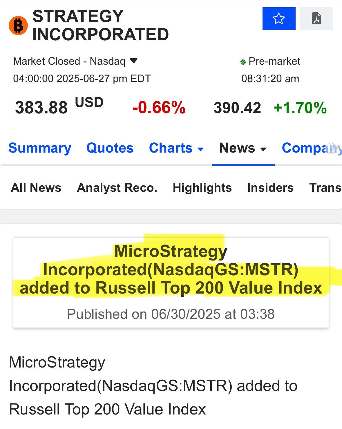 MicroStrategy has officially been added to the Russell Top 200 Value Index.