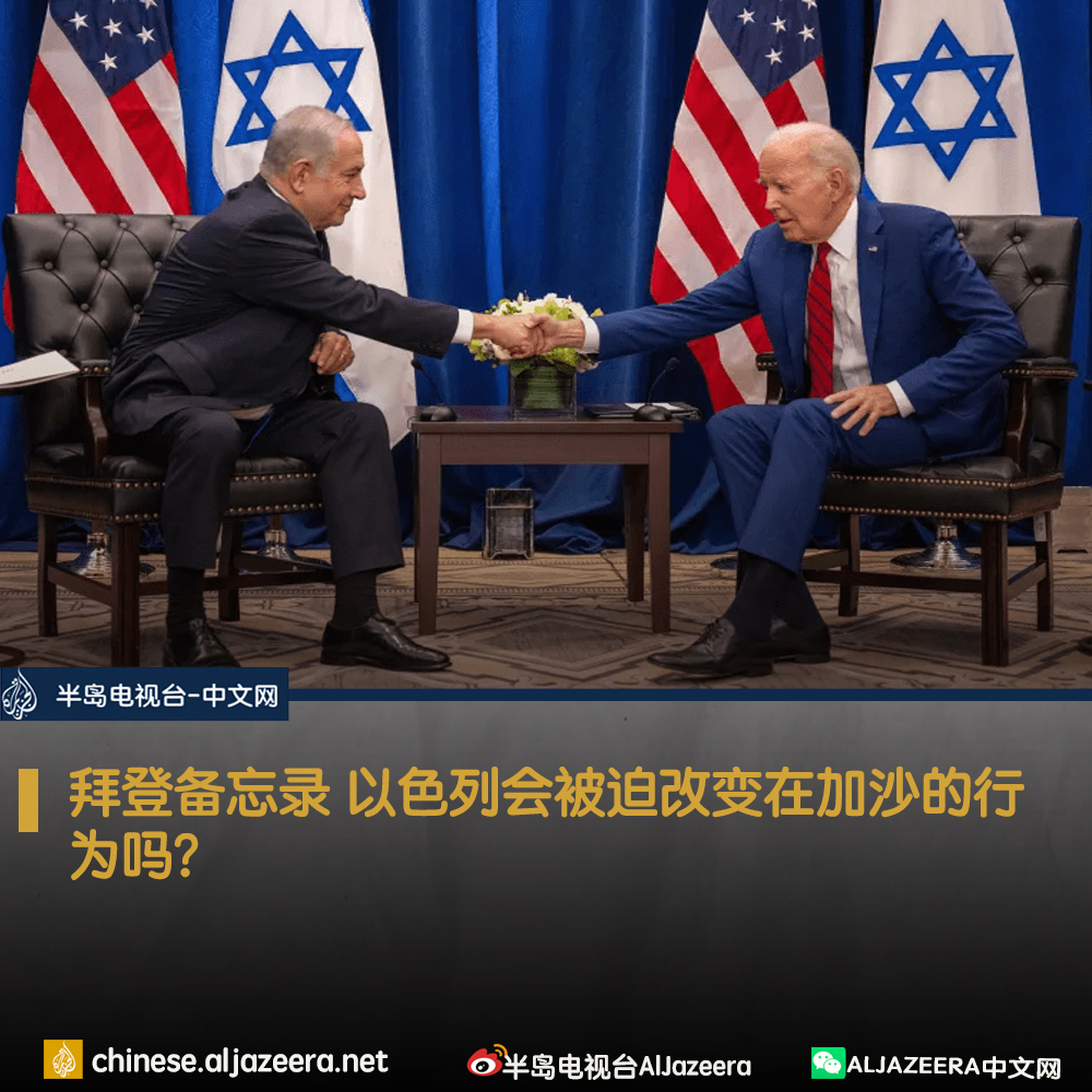 美国总统乔·拜登政府在军事、财政、情报、外交和司法上全力支持以色列对加沙地带的侵略,四个多月后,拜登发布了一份国家安全备忘录,要求美国军事援助的接受者——包括以色列——出具书面证明,证明他们将遵守人道主义法和国际法,并将配合美国的人道主义援助工作。