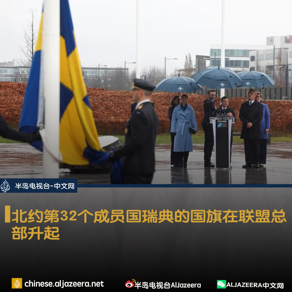 瑞典国旗在布鲁塞尔的北约总部升起,从而标志着该国在俄罗斯对乌克兰战争爆发两年后正式加入该军事联盟。