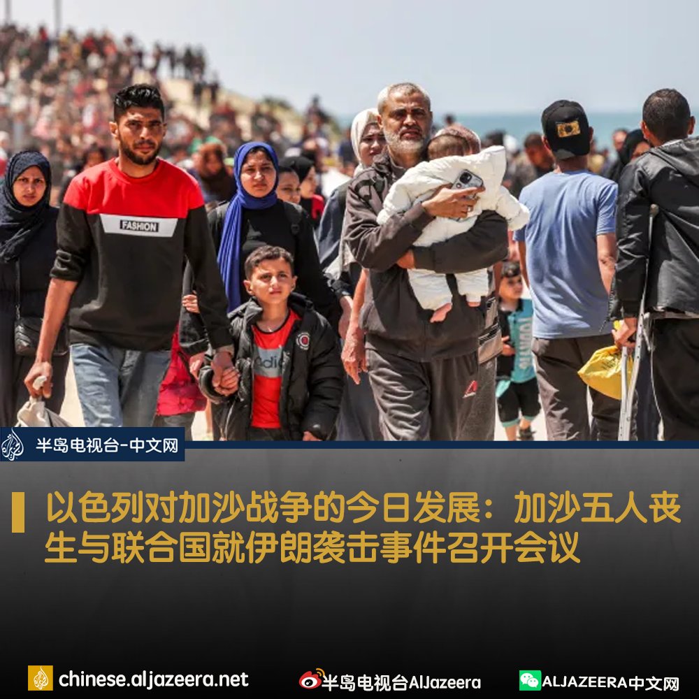 以色列军队轰炸加沙中部努塞拉特难民营,造成五人死亡、数十人受伤,与此同时,联合国安理会开会讨论伊朗对以色列的报复性袭击。