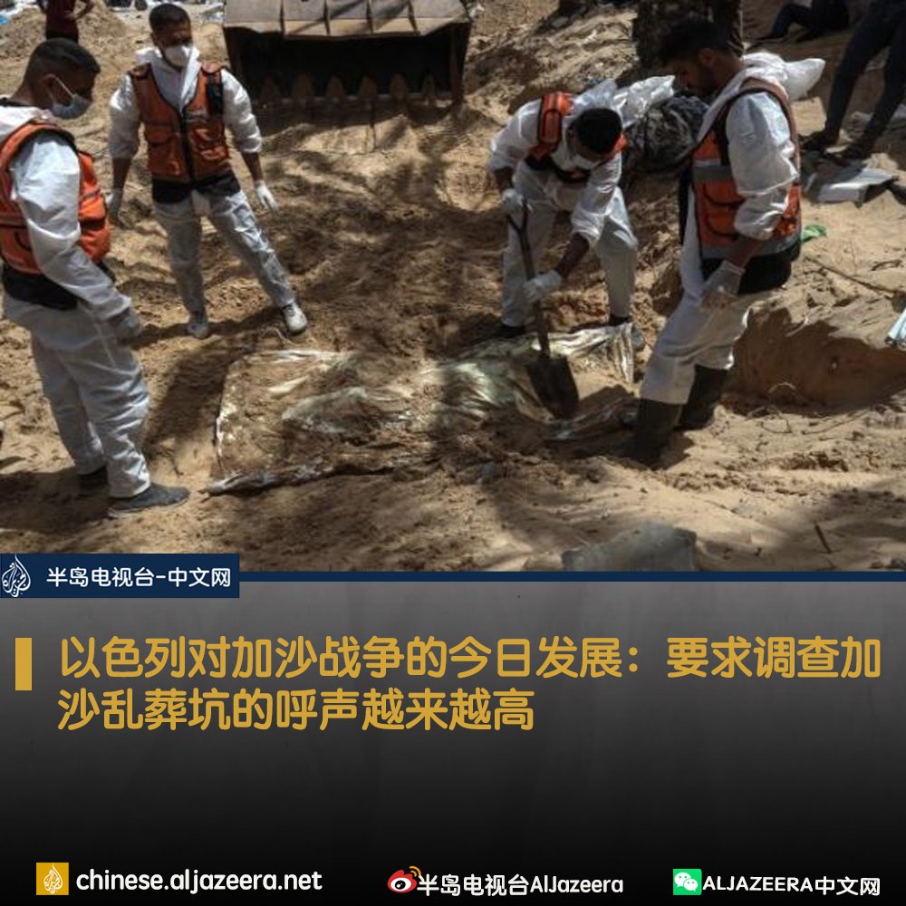 在以色列军队撤出加沙医院后,人们从该医院内的两个乱葬坑中挖出了超过300具尸体,联合国呼吁对此开展独立调查,而欧盟也支持这项呼吁。
