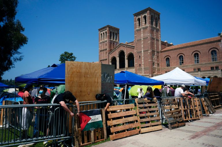 周三,在加州大学洛杉矶分校的亲巴勒斯坦营地入口处,活动有序、安静地进行,只有一架警用直升机在头顶盘旋,发出持续的嗡嗡声。