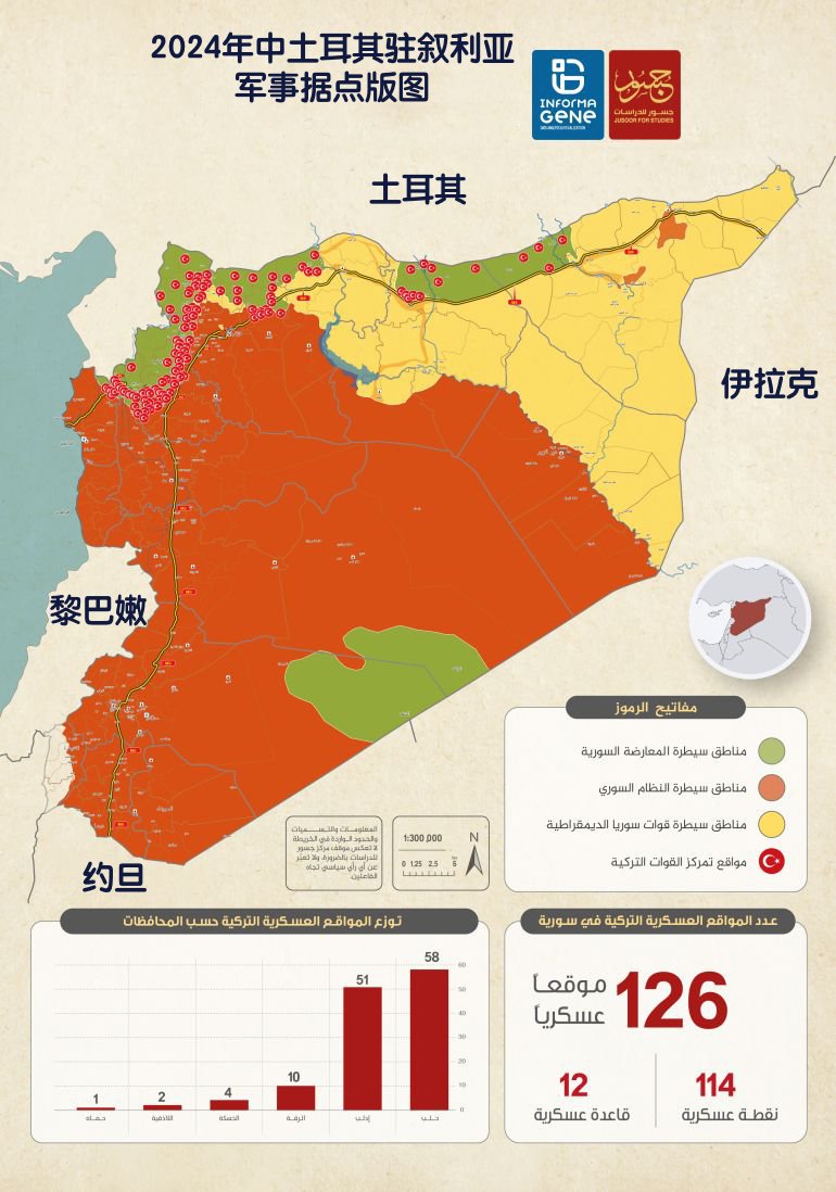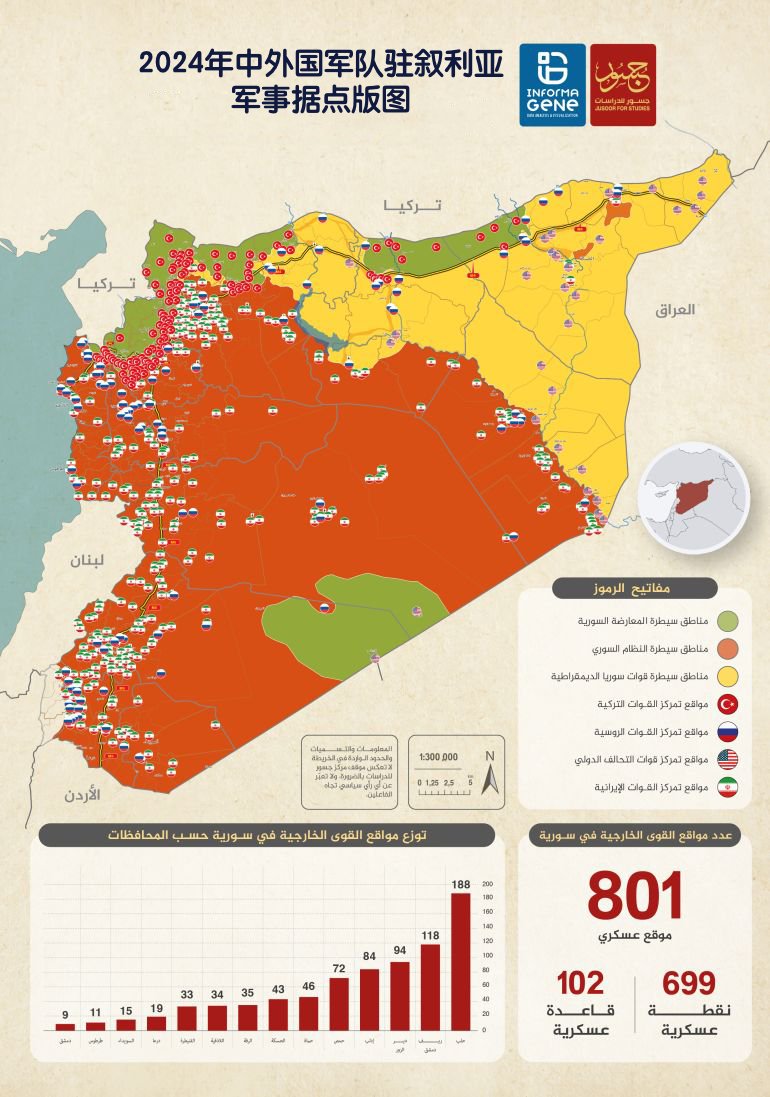 “朱苏尔研究中心”发布的一份内容广泛的报告监测了叙利亚境内的外国军事存在据点版图,重点关注了外国军队的固定军事地点,其中不包括据点、障碍以及移动和临时检查站