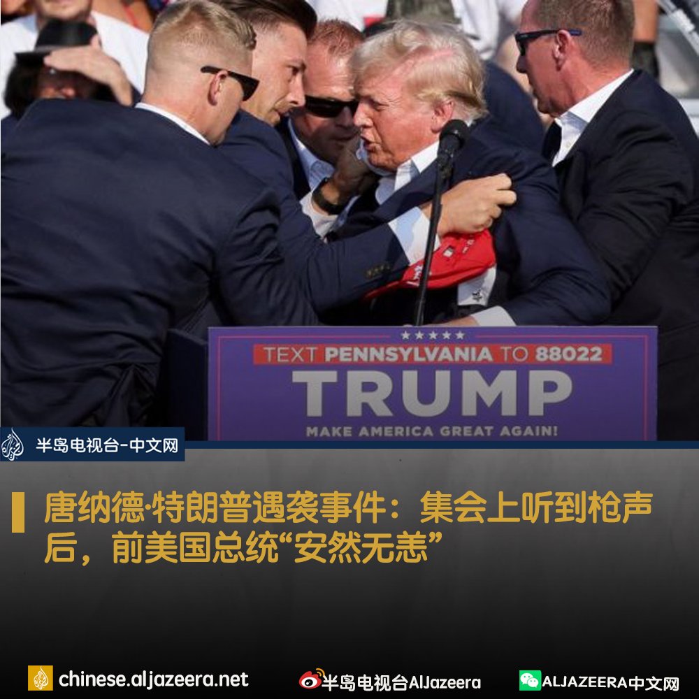 在宾夕法尼亚州巴特勒的集会上,前美国总统唐纳德·特朗普在人群中传出枪声后被护送下台,目前“安然无恙”。