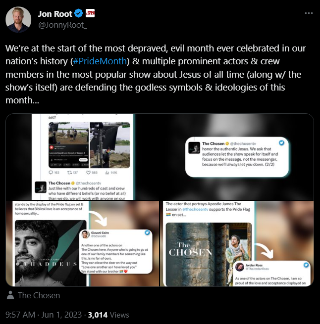 I was enjoying The Chosen, but not anymore. They are apparently all aboard the #pride train to hell. https://twitter.com/JonnyRoot_/status/1664300256803323904
