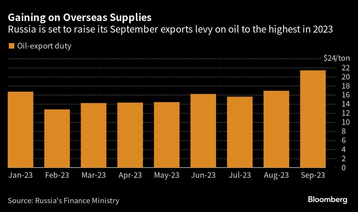 Russia will raise the export levy paid by its oil producers in September to the highest level this year, boosting state coffers as the price of the nation’s crude surges. #press