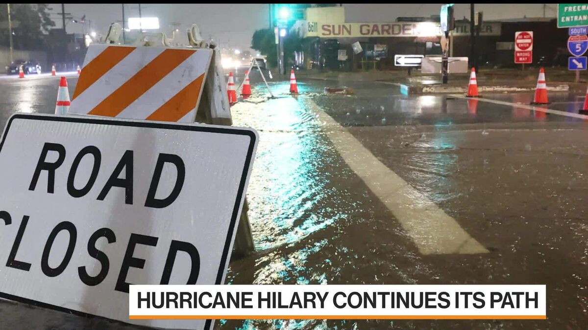 The remnants of Tropical Storm Hilary pummeled California with flooding rains on Monday, disrupting flights and knocking out power across parts of the state. The storm, now a post-tropical cyclone, came ashore late Sunday. Separately, a 5.1-magnitude earthquake rattled Southern California on Sunday. Bloomberg's Sarah... #press