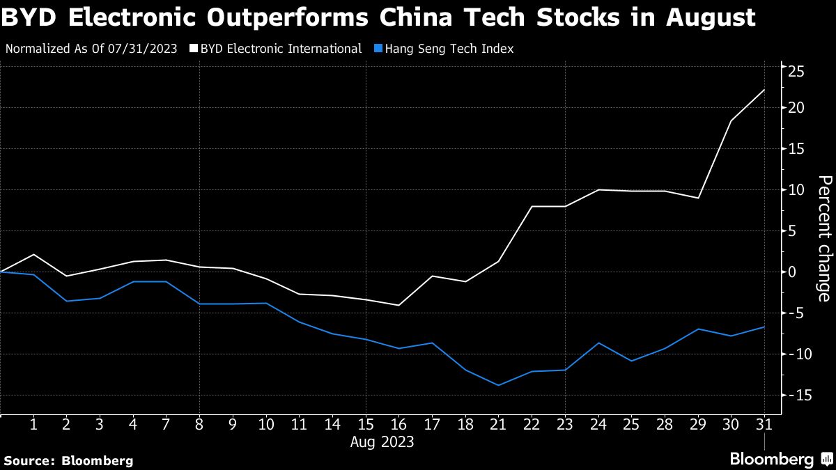 A unit of electric-vehicle maker BYD Co. that also supplies parts for Apple Inc. has climbed 23% this month, making it the best performer on a benchmark of Chinese technology stocks. #press