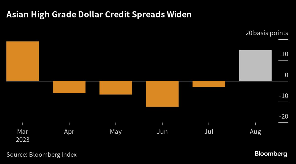 Yield premiums on high-grade Asian dollar bonds were on course for the sharpest monthly jump since March as concerns about China’s ailing economy and property woes weighed on demand. #press