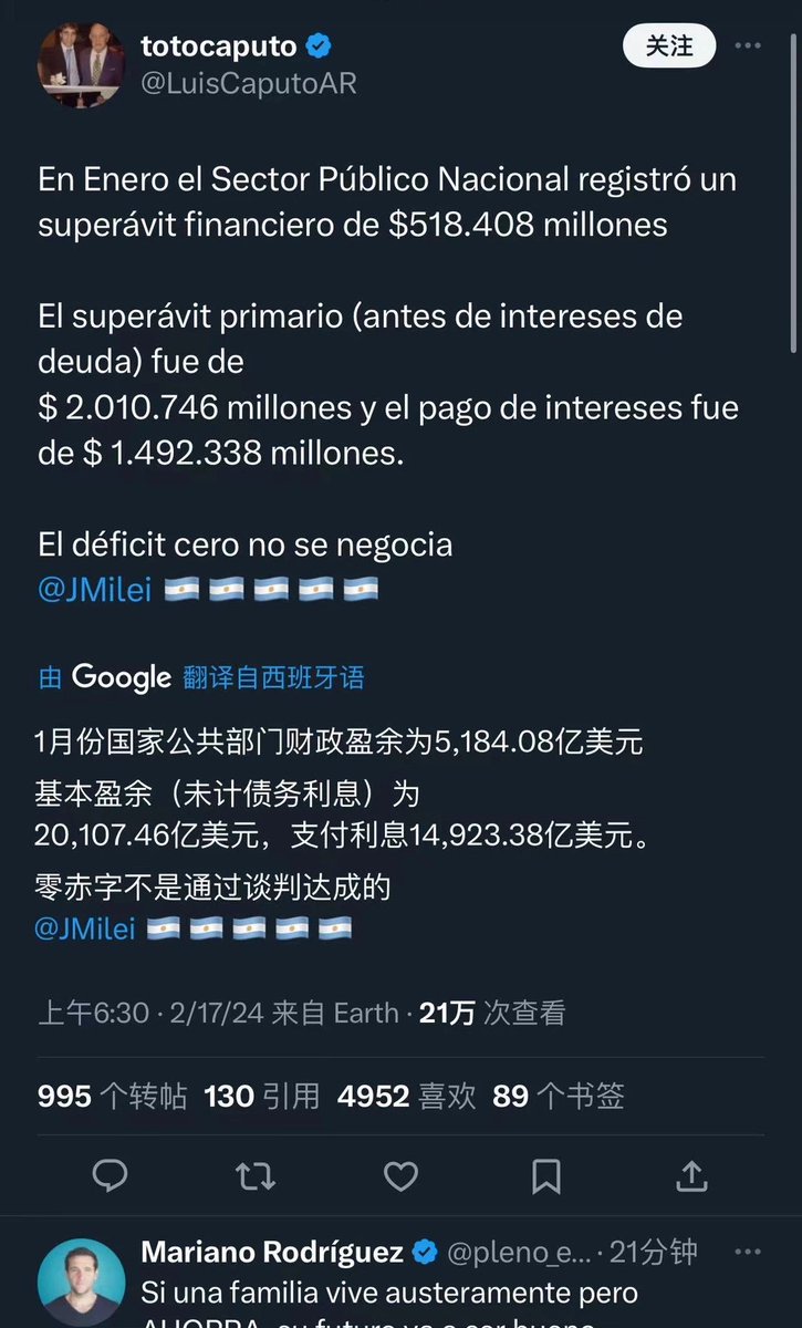 阿根廷的变革立竿见影了,其财政出现盈余了 https://t.co/Lp3vWSnAgN