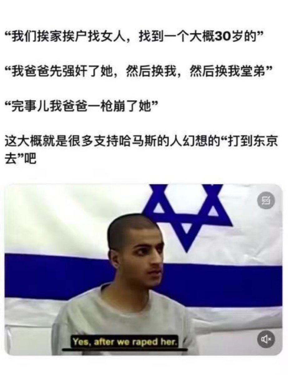 去年10.7画面就是哈马斯在屠城,按照古代的正确做法,对等的屠城,杀光杀痛为止,这样一天撅五次屁股的才会老实。参考陕甘回回叛乱,最后汉人杀痛了这帮白帽子。