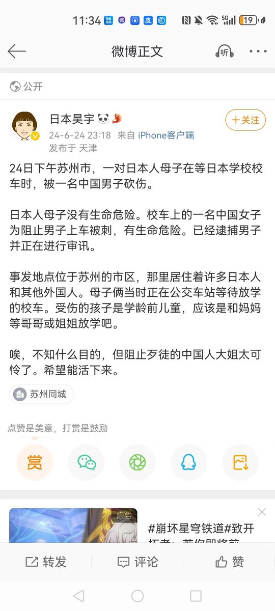 又一起砍伤外籍人士案件发生在苏州,离上次四名外教遇刺仅一个多月。前一次是美国人,这次是日本人。仇日恨美教育种下的恶果,还想让老外来投资吗? https://t.co/L0LFrZaBrv