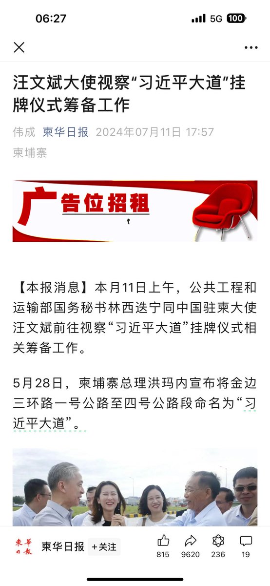 “习近平大道”在柬埔寨公路命名😁👍 https://t.co/m2dUhIWu9i