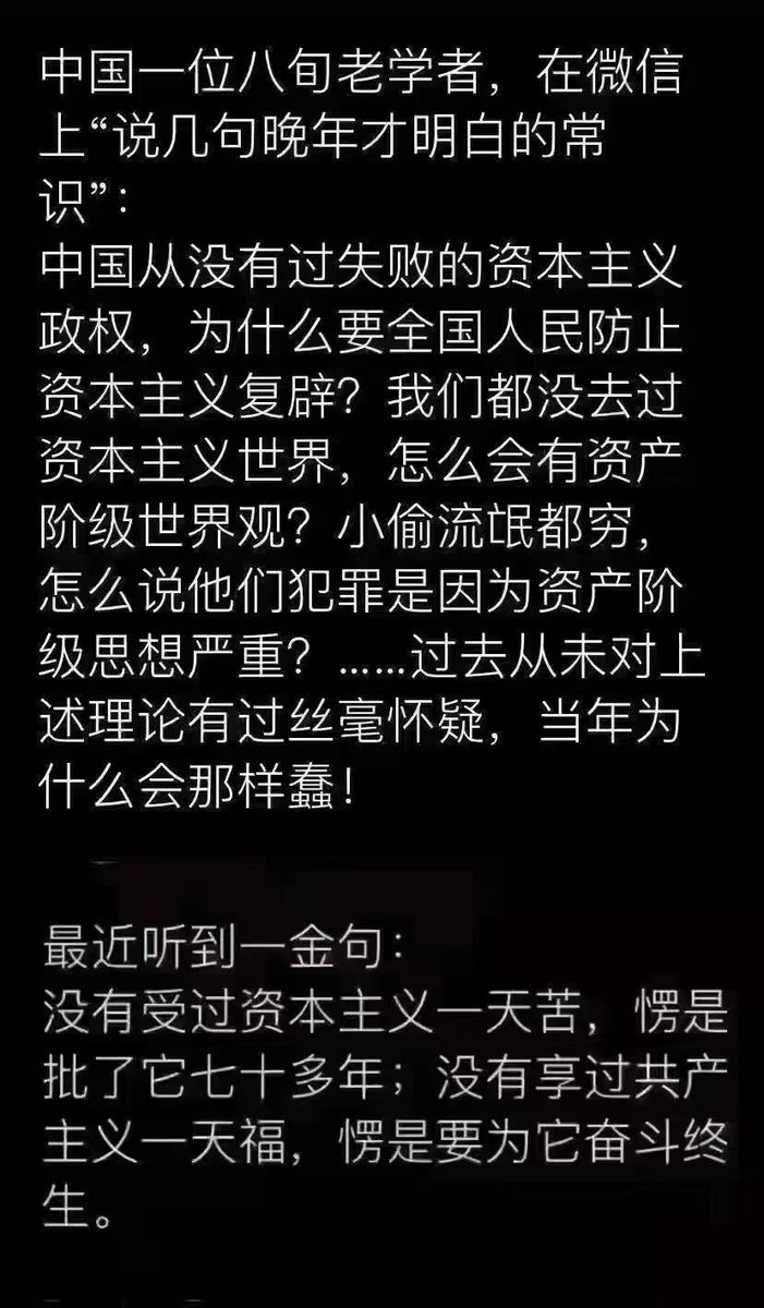金句:没有受过资本主义一天苦,愣是批了它七十多年;没有享过共产主义一天福,愣是要为它奋斗终身。 https://t.co/SbRZFOK7MD