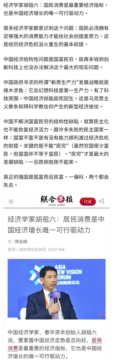 胡祖六:居民消费是最重要的经济指标,它也是中国经济增长唯一可行驱动力👍 https://t.co/VHWWypqdFx