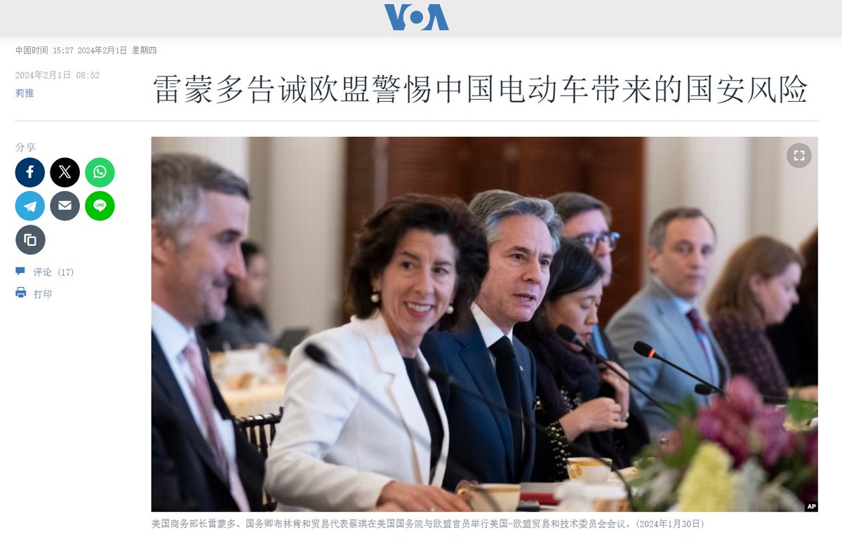 对了,之前说过的,中国成为世界第一大汽车出口国,这件事对欧美触动太大。华府对中国电动车加征关税已经几乎成为共识,最终目标从美国汽车市场排除中国供应链。美国商务部长雷蒙多甚至跟欧盟说中国电动车带来重大国安风险。