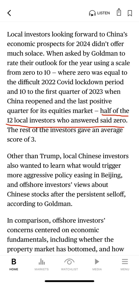 彭博调查了北京上海的12家境内机构客户,问他们对2024年中国经济前景信心,0-12打分,其中一半打的是0分,其余投资者平均分是3。