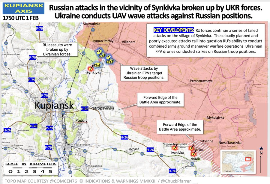 乌克兰库皮安斯克战区: 2 月 1-2 日/俄罗斯在 Synkivka 附近的袭击被乌克兰部队。乌克兰对俄罗斯阵地进行无人机攻击,和火炮打击。俄罗斯损失惨重,包括几十辆军车坦克,和一百多俄军。 https://t.co/1ZhOdGgmBm
