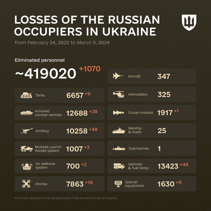 乌克兰保卫家园,已经741天。截止今天,3月5日,俄军的总共损失: