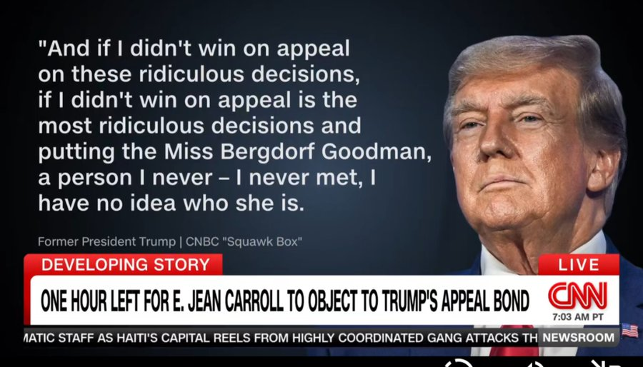 特朗普今天早上继续每天诽谤E.Jean Carroll,称她为“伯格多夫·古德曼小姐”。