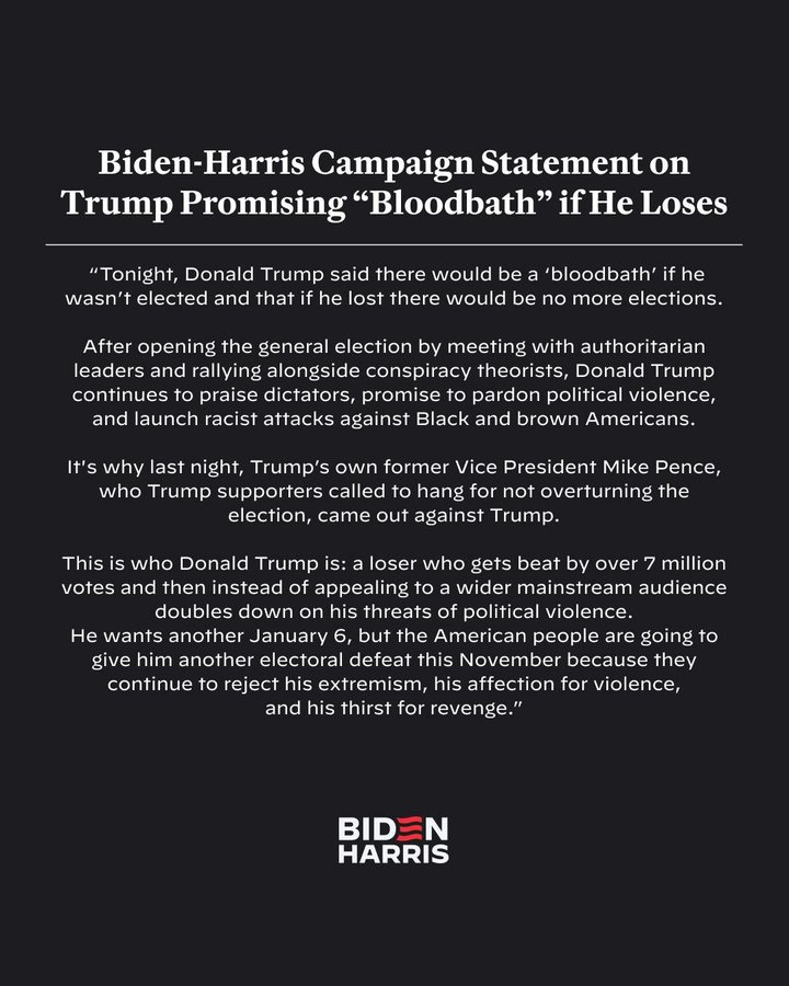 拜登(经典白左)竞选发布声明:川普表示,如果他没有当选,将会发生“大屠杀”bloodbath。这次2024年选举不是拜登与川普的较量,而是自由与法西斯主义的较量。 https://t.co/eJdJ74H3xn