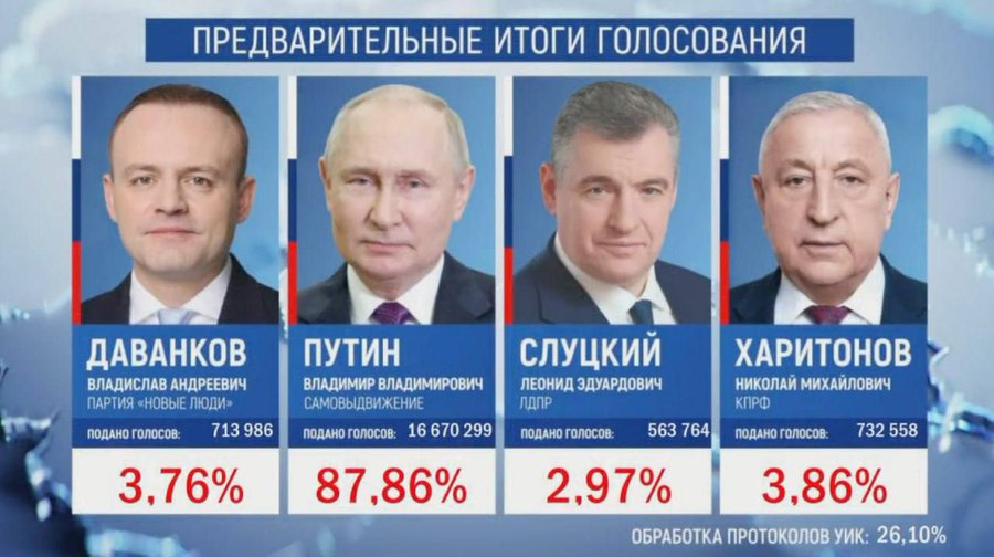 川粉红粉的基督大神,普京,以87.86%,高票当选俄罗斯总统。俄罗斯人今天挺惊讶,怎么还有其他三个总统候选人?没人知道啊。 https://t.co/9l8leBSbI3