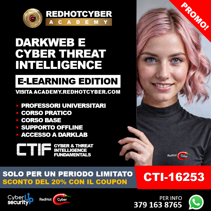 ⏳Coupon per risparmiare il 20%. Solo per un periodo limitato cliccando al link https://academy.redhotcyber.com/courses/darkwebcti?th__ug=f8ee558d&th__c=cti-16253