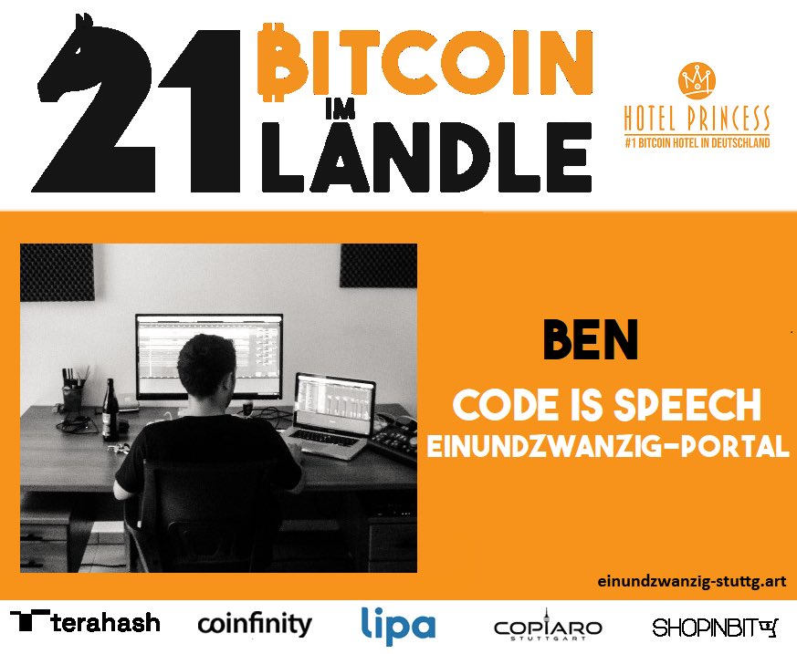 Ben, das Genie hinter dem @einundzwanzig_p wird einen Vortrag über „Code is Speech“ halten🤩