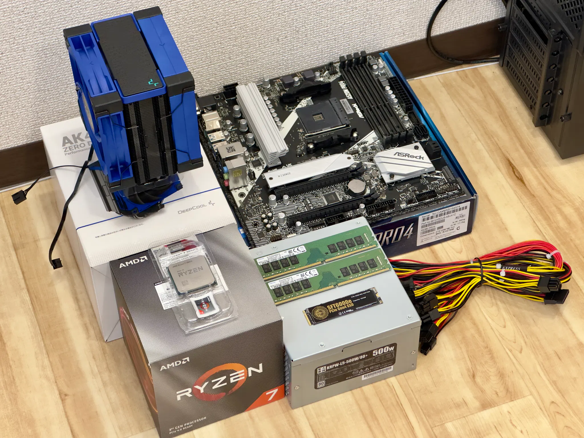今回ちゃんと買ったパーツはCPUとCPUクーラーとマザボだけ。SSDとメモリと電源は家に転がってた適当なパーツを使います。