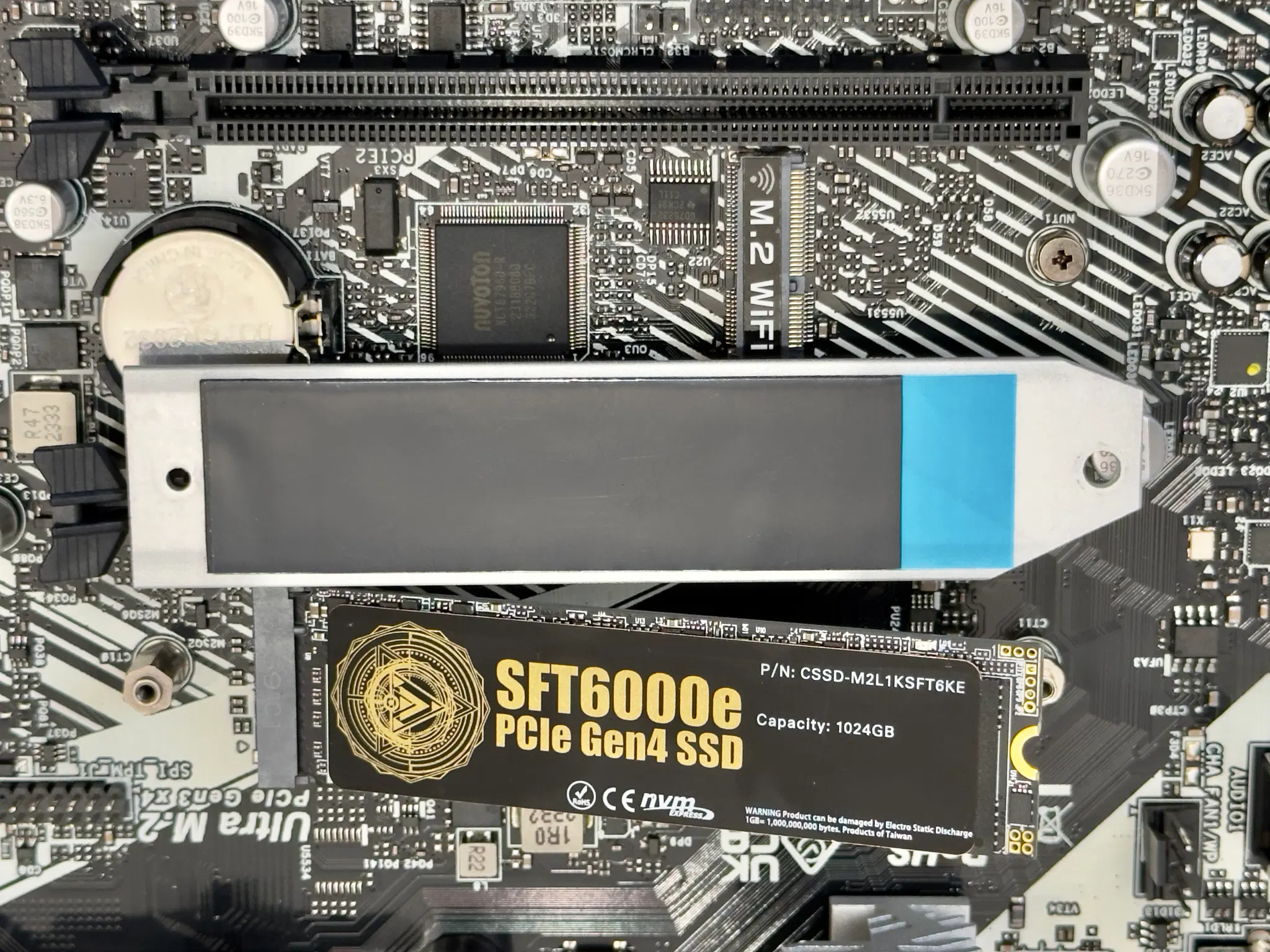 お次はM.2 SSDの取り付け。最近のマザボはM.2 SSDのヒートシンクがデフォで付いてるので助かる!くれぐれもヒートシンク裏の伝熱シートの保護フィルムは剥がし忘れないようにしような!お兄さんとの約束だぞ!