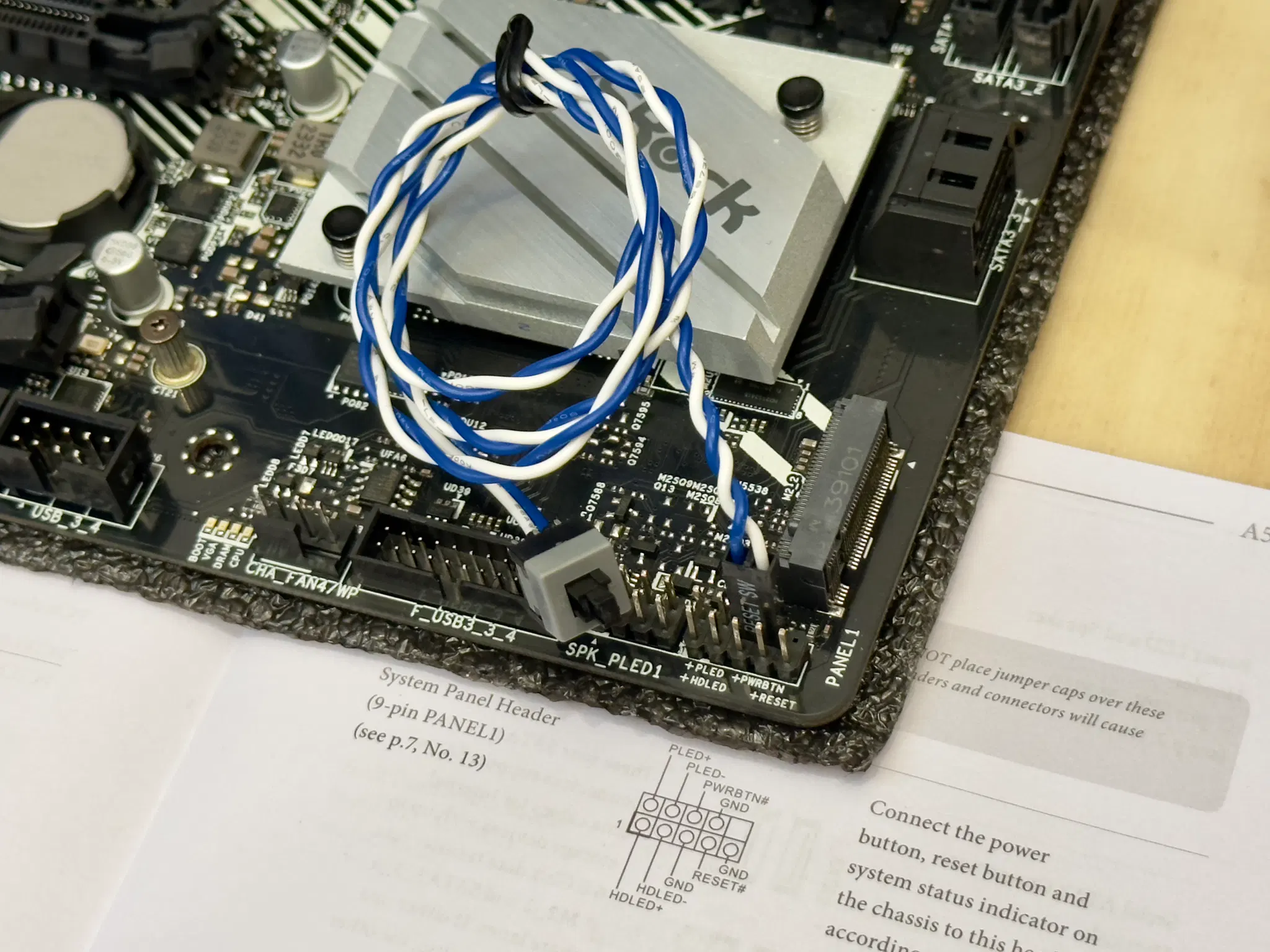 最後に忘れちゃいけない電源スイッチの取り付け。とりあえずPCケース無しで動かしたいので、こういう時に役に立つのがデバッグ用の電源スイッチ。念のために説明書を対照してピンのアサインを確認しつつ、適切な箇所にコネクタをブスリ。200〜300円くらいで買えるので持っておくと何かと便利。