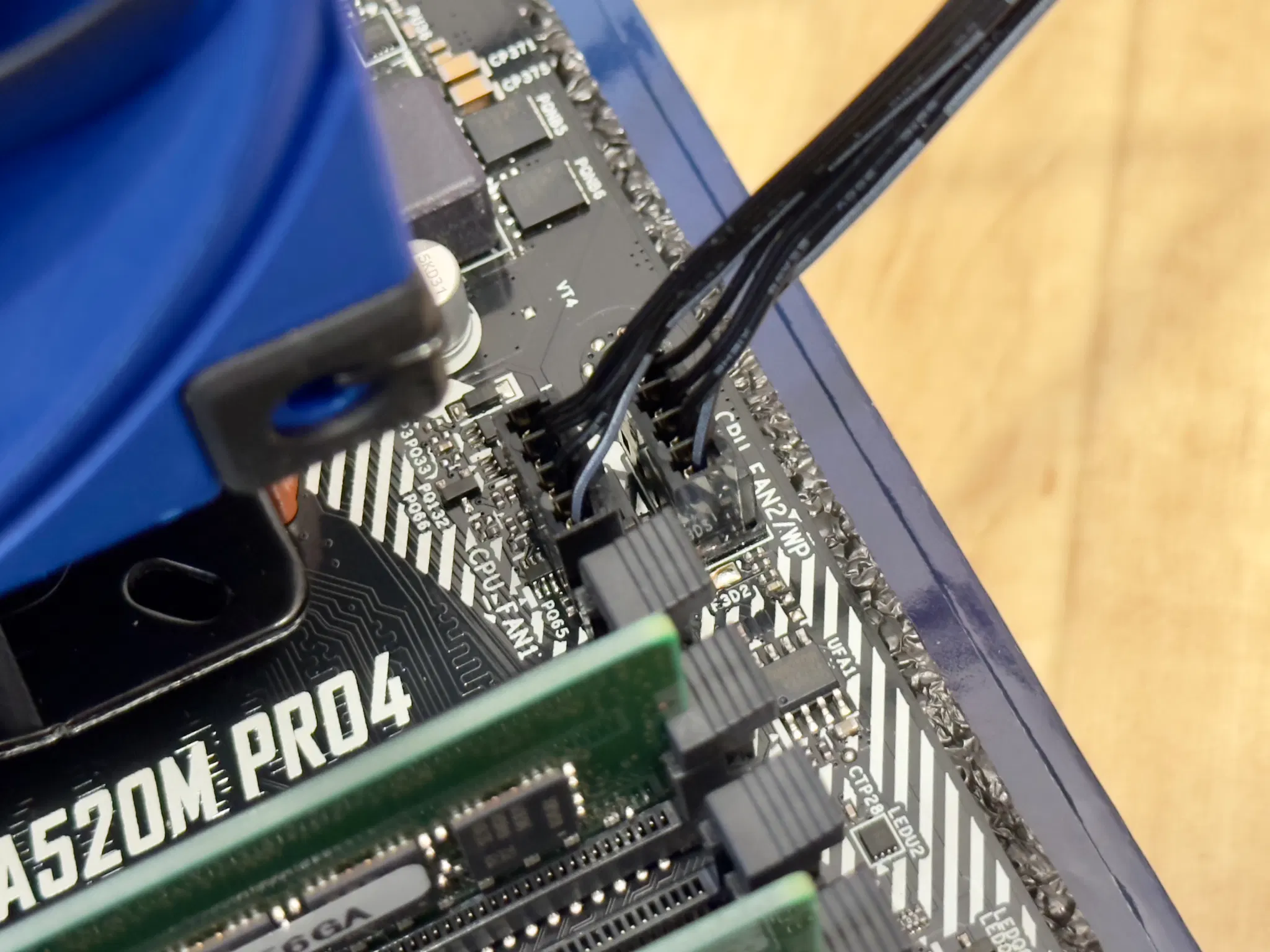 ヒートシンク部の固定を済ませたのちに再度ファンを取り付けて、ファンの電源をマザボに刺す。今回はファンを2個取り付けたんだけど、このマザボのCPUファン用のコネクタ配置が中々好みかも。
