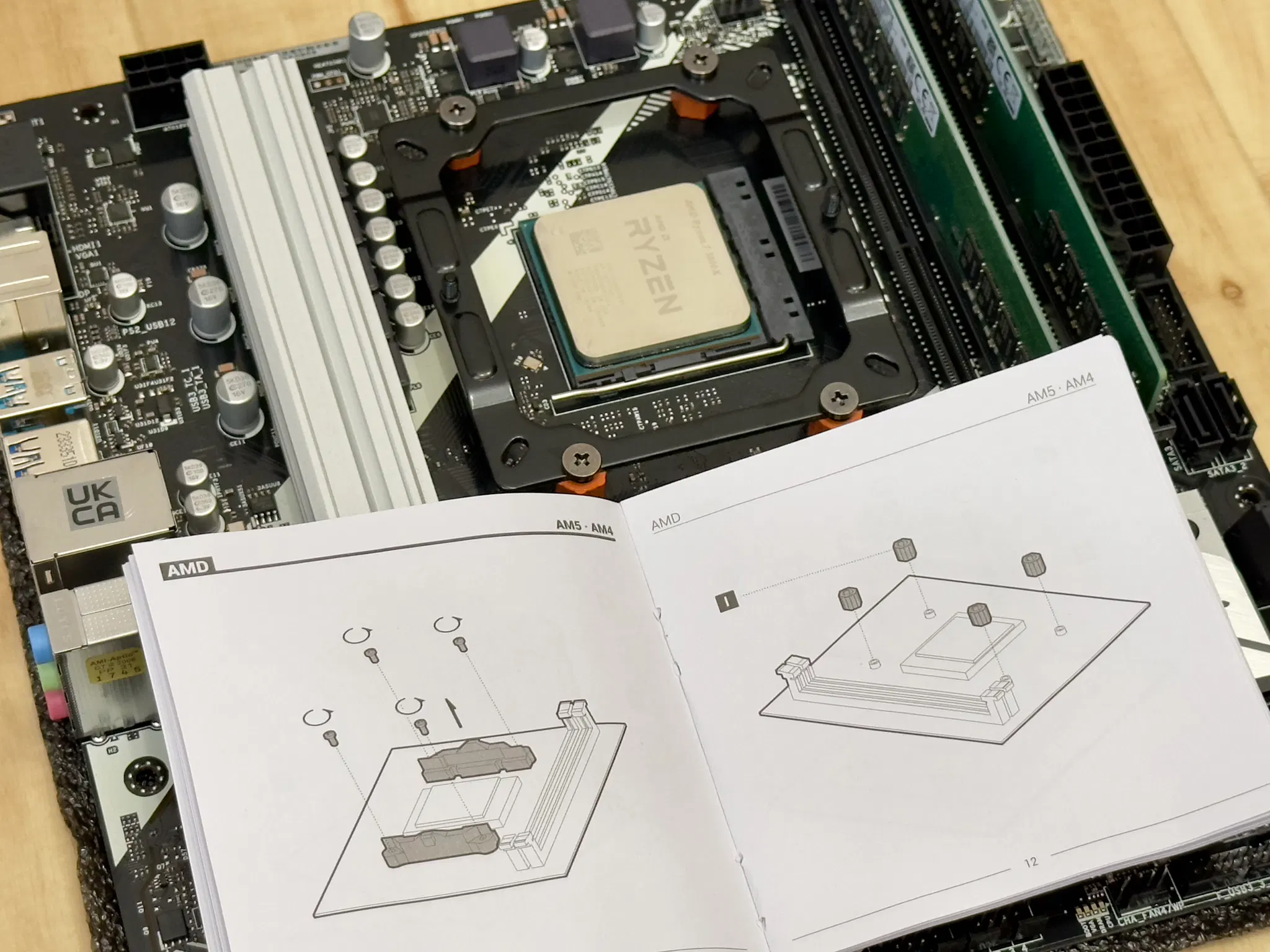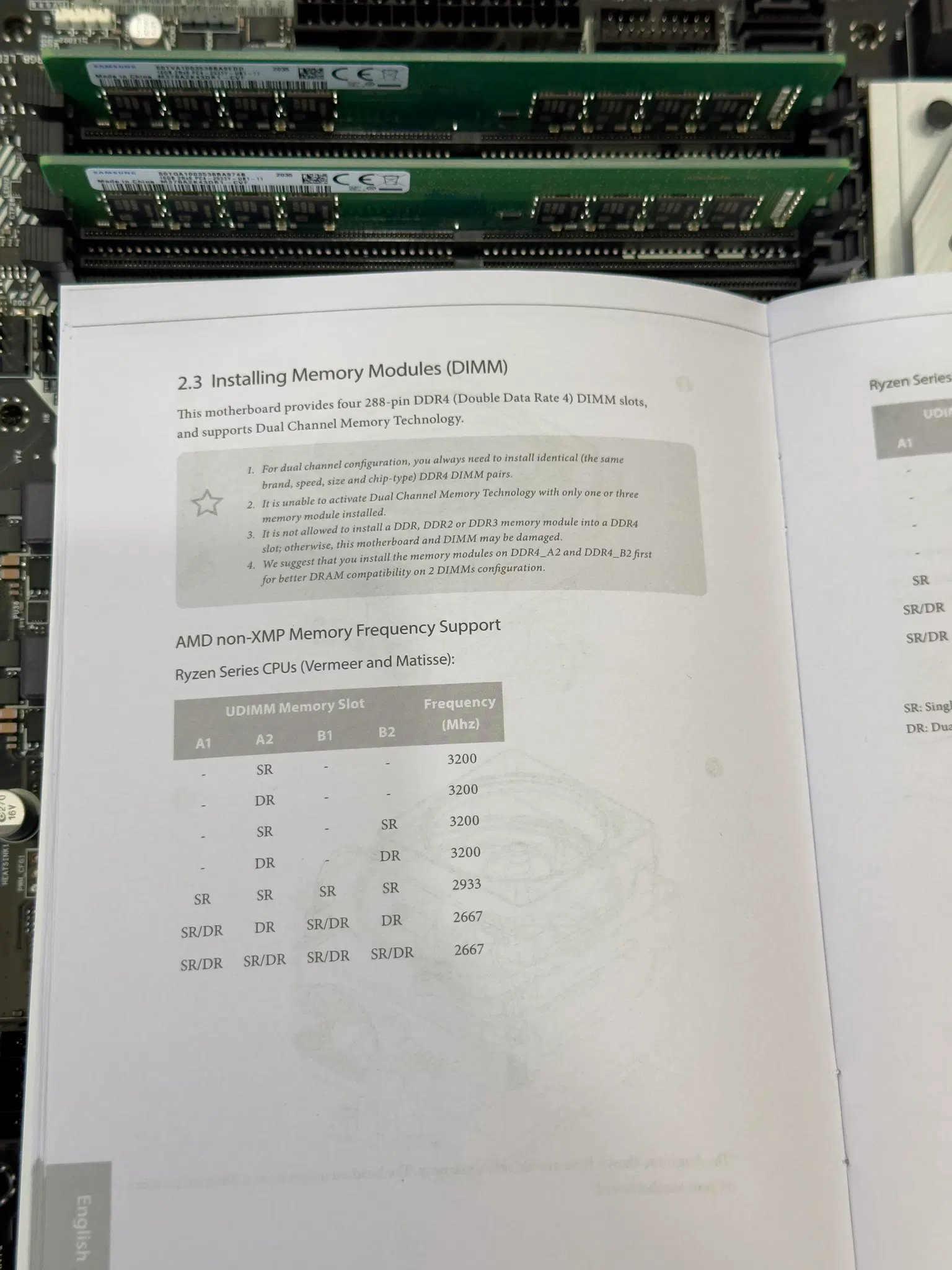 初心者だとちょい躓きやすそうなメモリの取り付け。4枚の場合は何も考えずぶっ刺せば良いんだけど、今回は4スロに2枚のみ刺すので要確認。確か3800XはMatisseだから、シートを確認してA2スロとB2スロに刺せば良さそう。