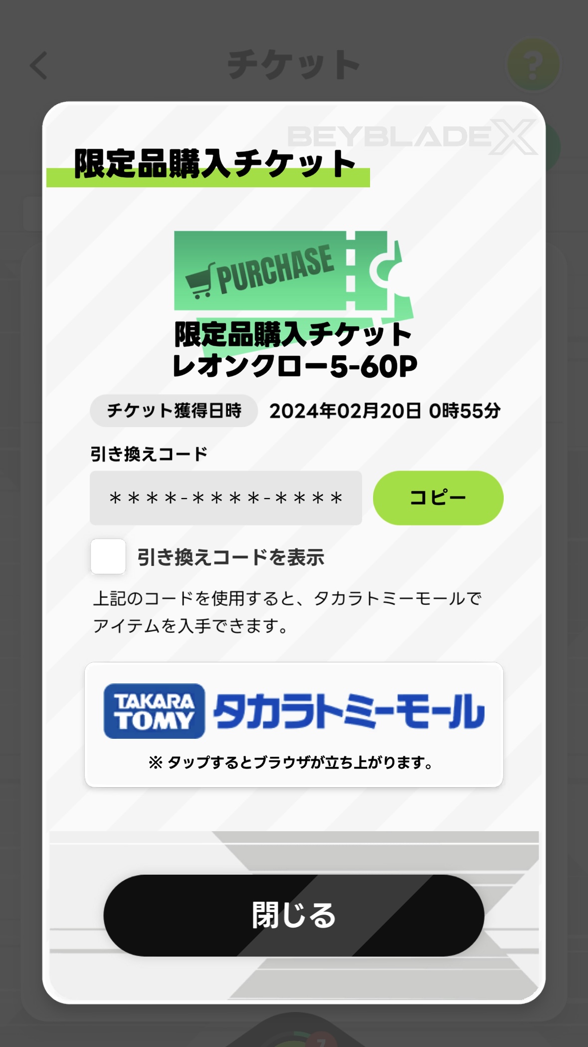 最初「ゲーム内の性能が強化されるとかどうせそんなんやろ」って思ってたらそうじゃなくて、発行された引換コードをタカラトミーモールに入力すると後日限定ベイブレードが郵送されてくるらしい
