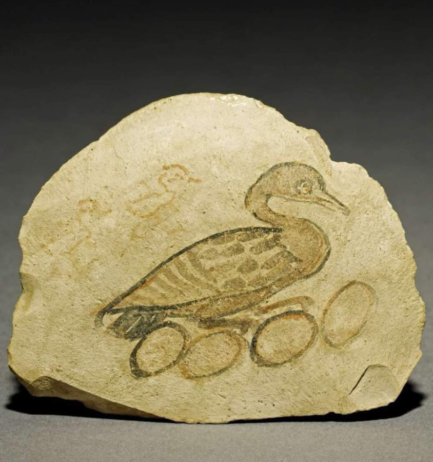 古埃及石灰石陶片上用墨水画着一只母鹅正在孵蛋。可以看到两只模糊的红色小鹅的身影,第十九至二十王朝(公元前 1292 年至公元前 1077 年)