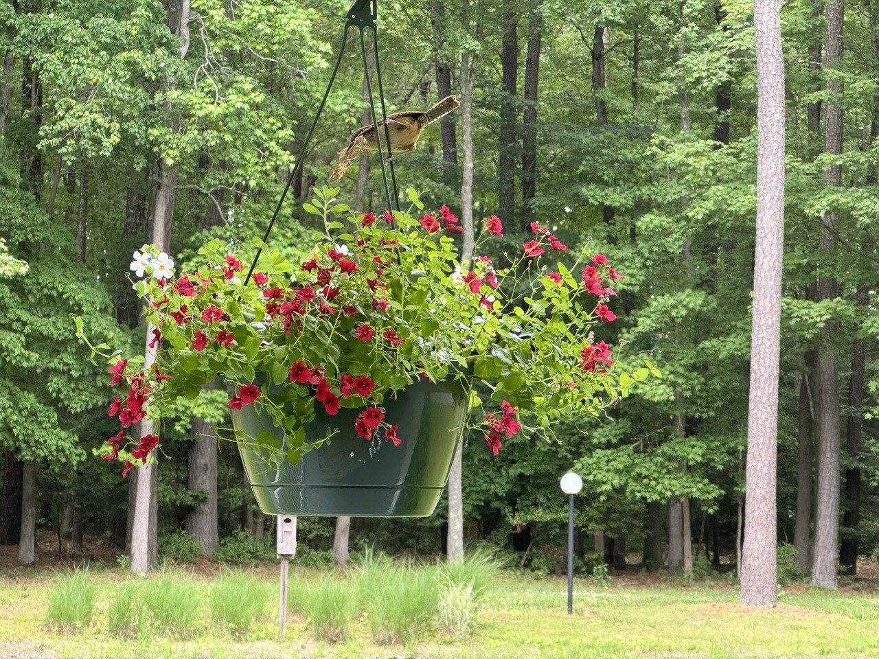 Good morning! So watering my porch plants will be a little more challenging this summer. A pair of Carolina wrens has decided that one of my hanging baskets is the perfect place to build a nest.