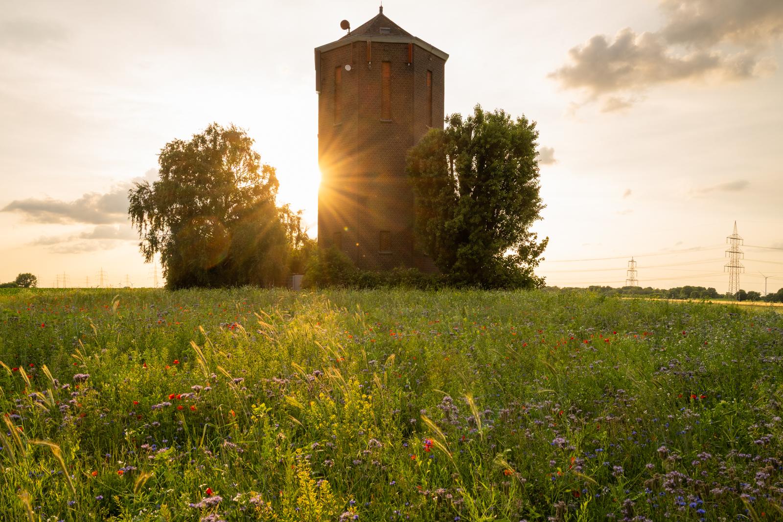 Kurzer Blick aus dem Fenster zuhause, könnte was werden. Kamera umgehangen und auf's #Fahrrad. Hat sich gelohnt, den Turm habe ich schon oft fotografiert. Mit der schönen Blütenwiese davor macht er das Foto schon speziell.