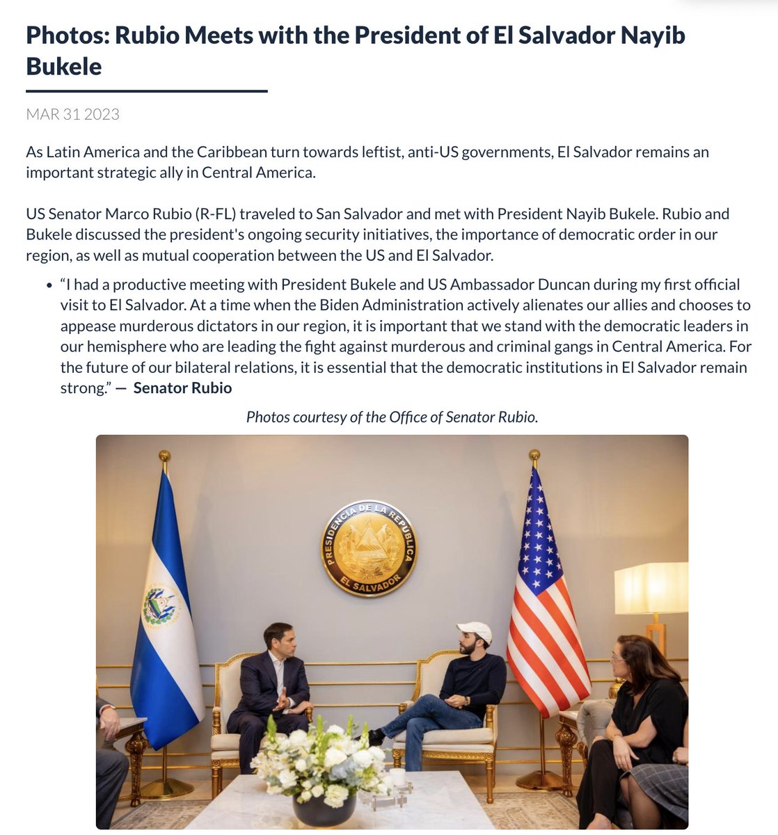 R to @maxkeiser: 4. it’s important we stand with democratic leaders in our hemisphere leading the fight against murderous & criminal gangs in Central America. For the future of our bilateral relations, it is essential that the democratic institutions in El Salvador remain strong.”— Senator Rubio