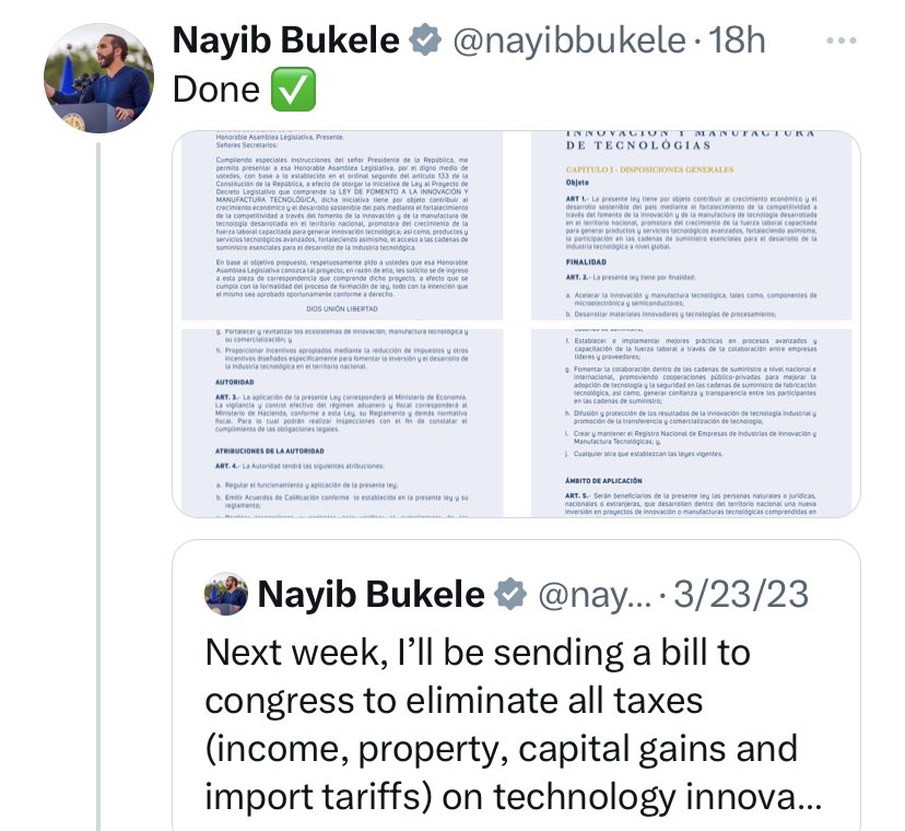 President @nayibbukele passes new law, 0% tax on tech innovation.