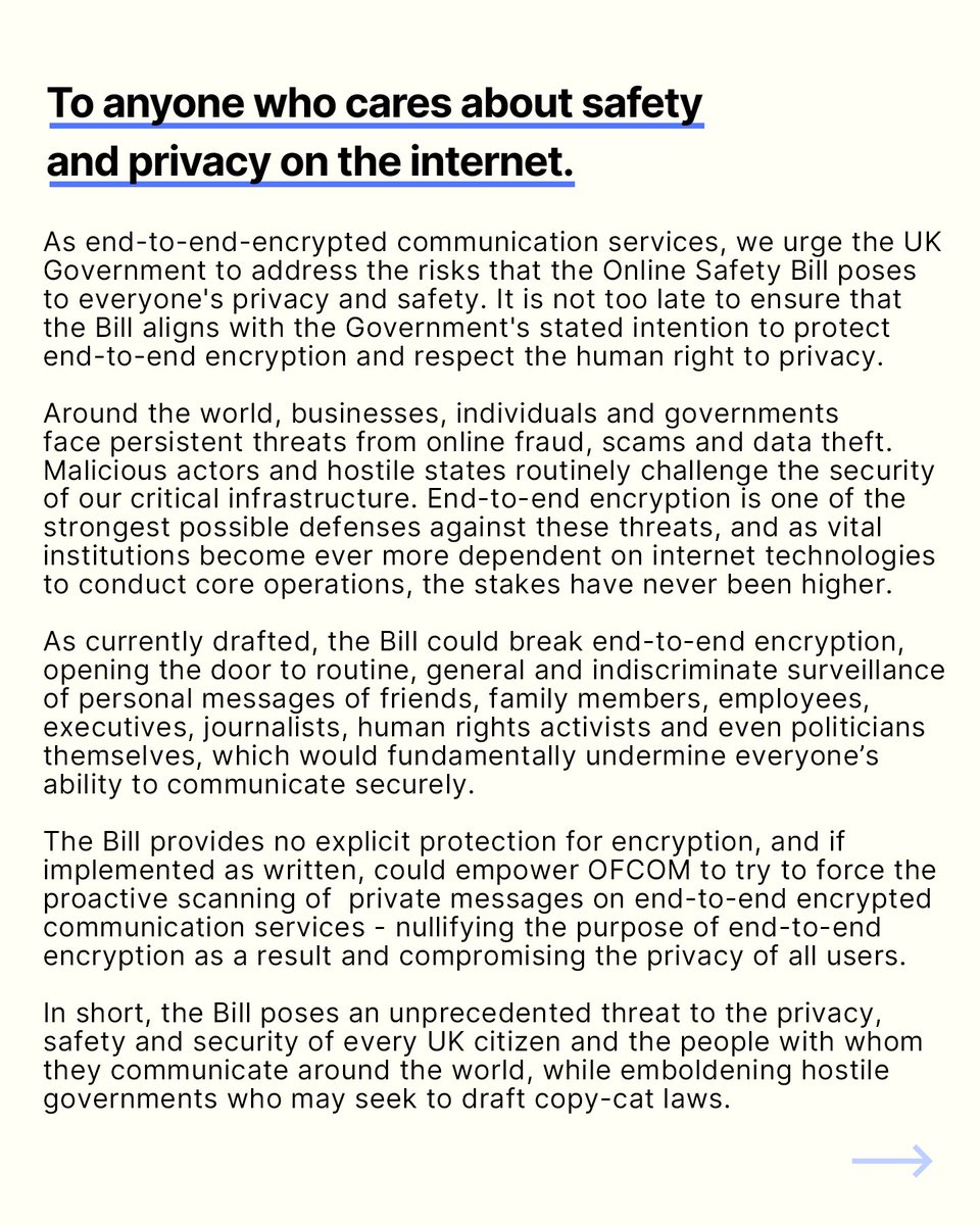 RT by @maxkeiser: Our position remains clear. We will not back down on providing private, safe communications. Today, we join with other encrypted messengers pushing back on the UK's flawed Online Safety Bill.