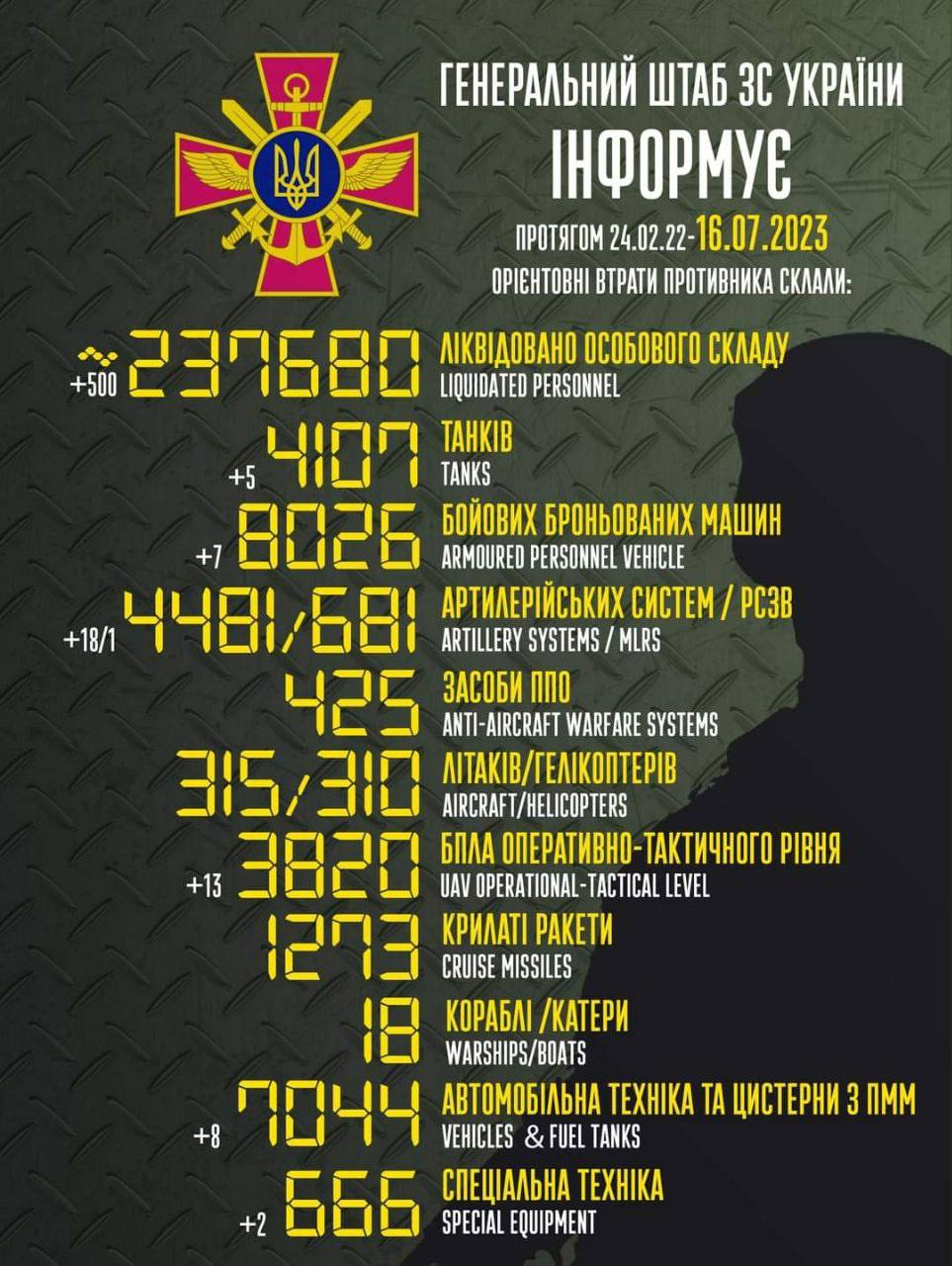 Russian losses per 16/07/23 reported by The Ukrainian General Staff