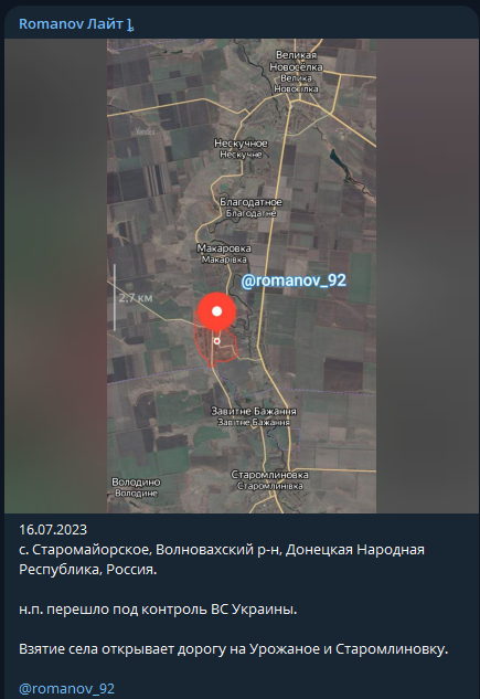 Russian milblogger Romanov reports that Staromaiors'ke, south of Velyka Novosilka is under the control of Ukrainian forces. Several days ago we reported that the AFU had indeed entered the outskirts and fighting was ongoing. We are waiting for the visual confirmation.