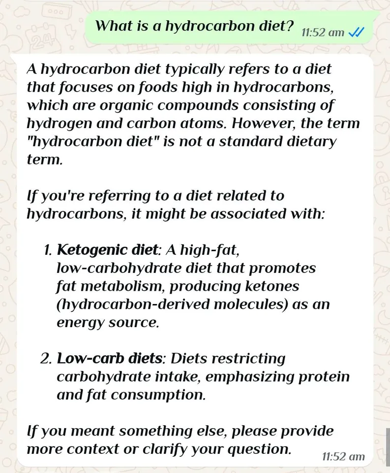 I don't know much about different kinds of diets, so asked a chatbot what a hydrocarbon diet is. And the result actually made me even more confused! π