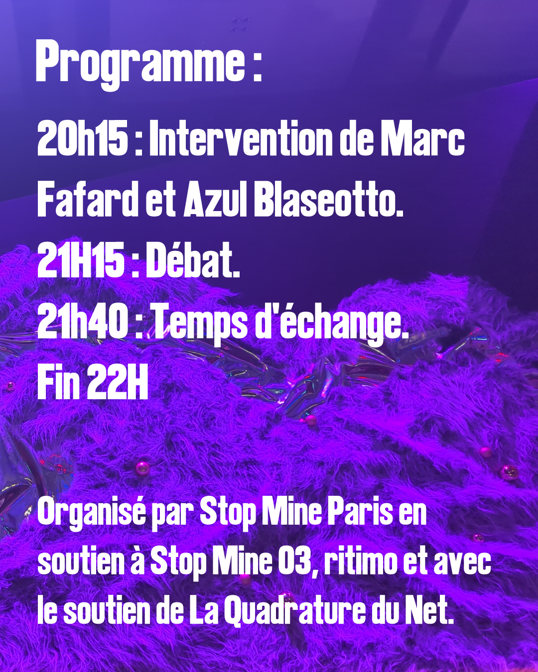 Organisée par Stop Mine Paris (en soutien à Stop Mine 03), nostr:npub1tpcsha0ffpn24nde8emttj7zl3cu8ga562j5ff8q8at2v754p7zsd84dfj et le soutien de nostr:npub1lfzext6enatxuj4zqe7mz3fttud2dsdn3ny0k98kccdnfe5fpg6qyx95wl
